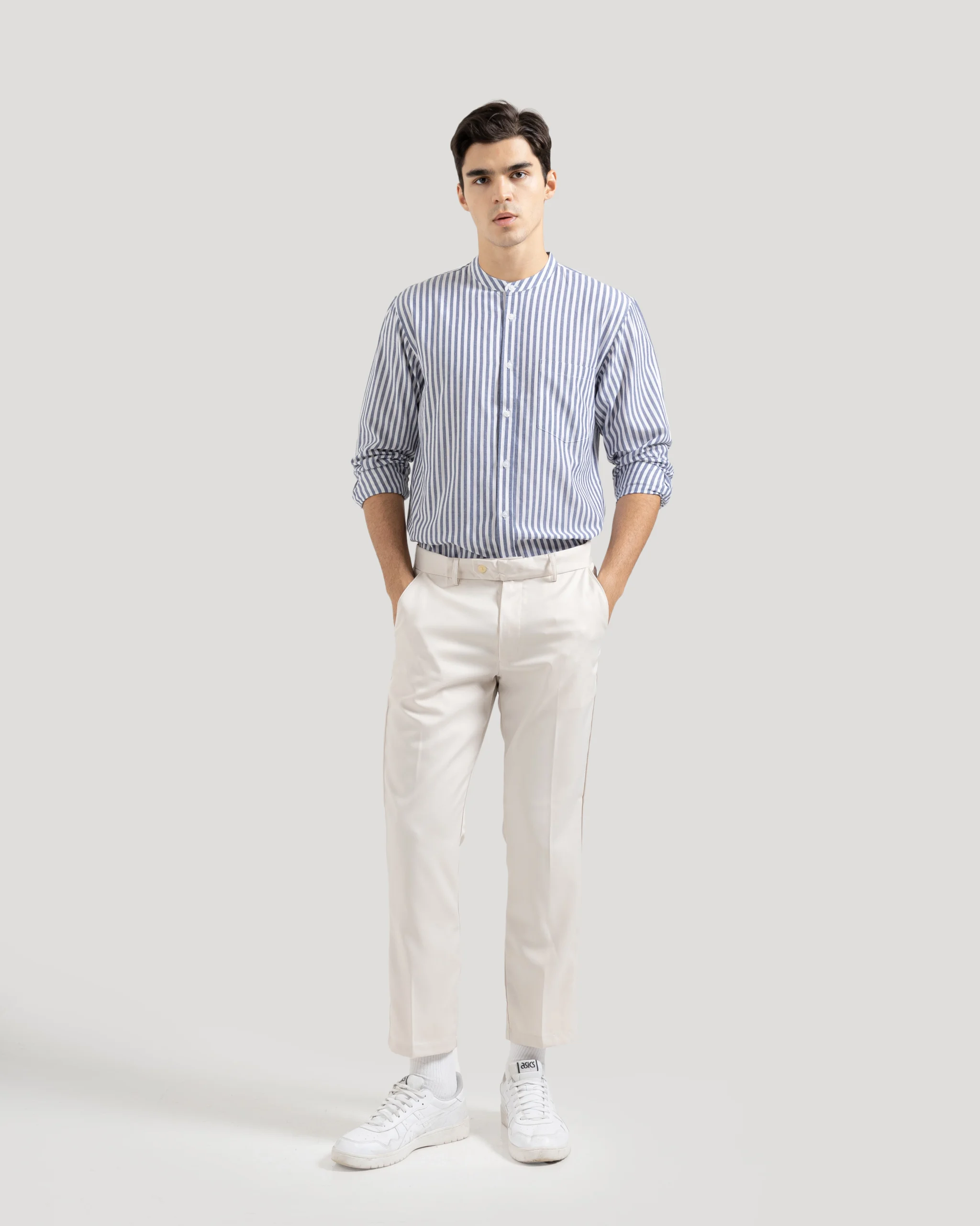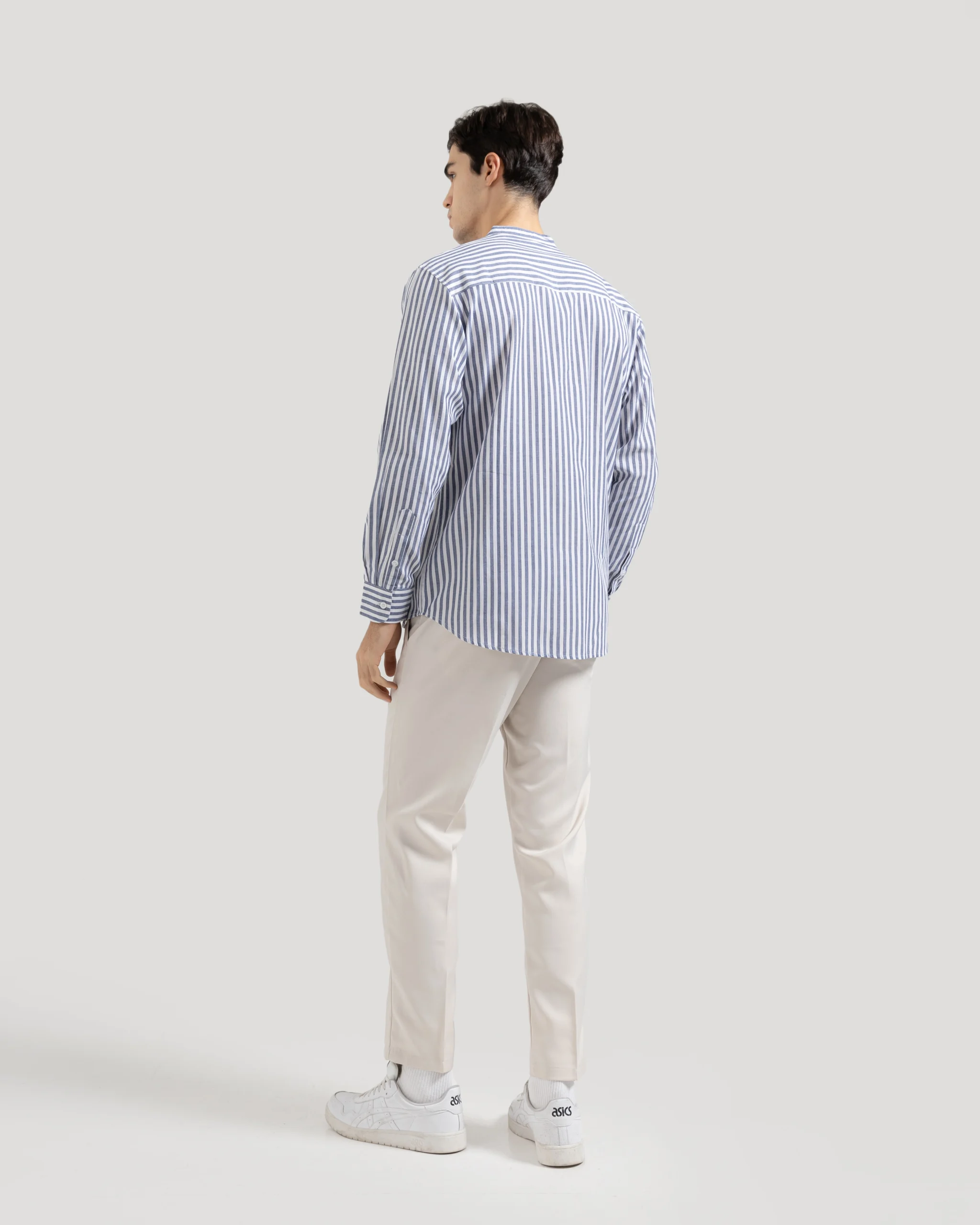 Desain kerah Shanghai memberi kesan leher lebih jenjang dan tampilan yang rapih. Pilihan tepat untuk gaya santai yang tetap terlihat rapi.